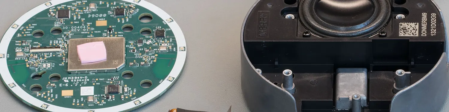 The metal shield can be removed using a small screwdriver. Under the shield, you will find the Echo Dot's main CPU and Flash memory.