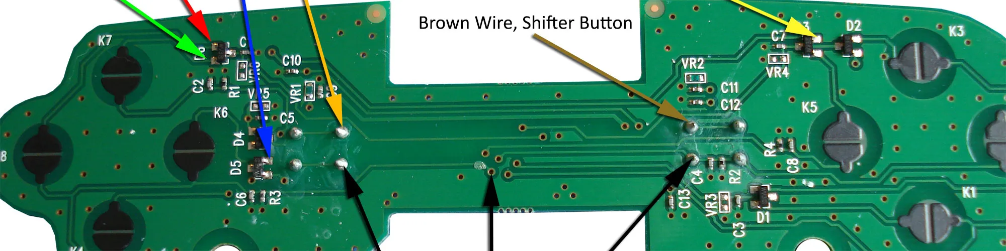 Adding six external phono plug connections for joypad buttons and gear shifter pads on the Xbox 360 wheel. These are to connect external gear shifters and hand brake systems.