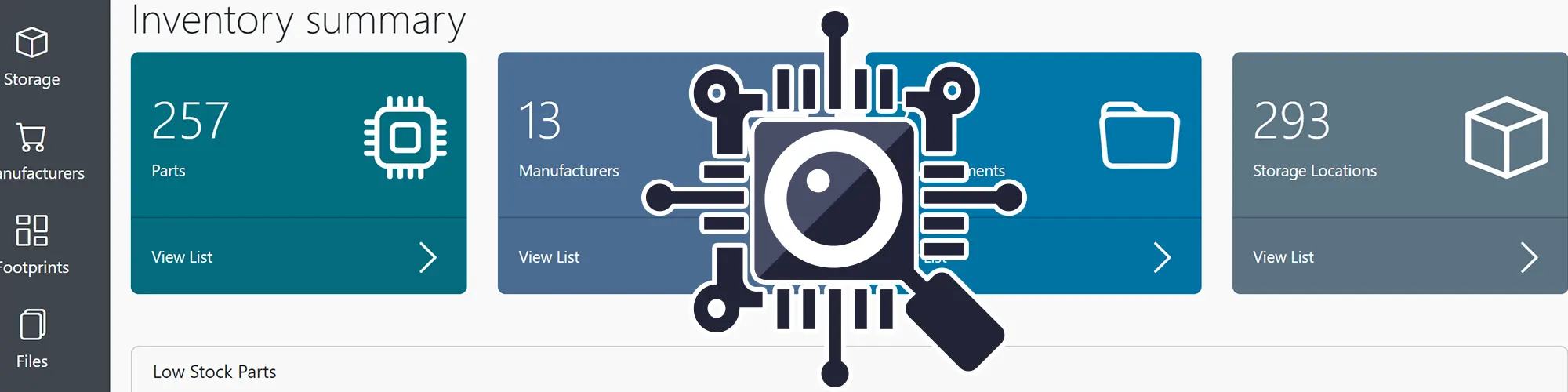 The Dashboard gives you an overview of the system with totals for Parts, Manufacturers, Attachments and Storage Locations. It also lists any parts which have less than your low stock level available.