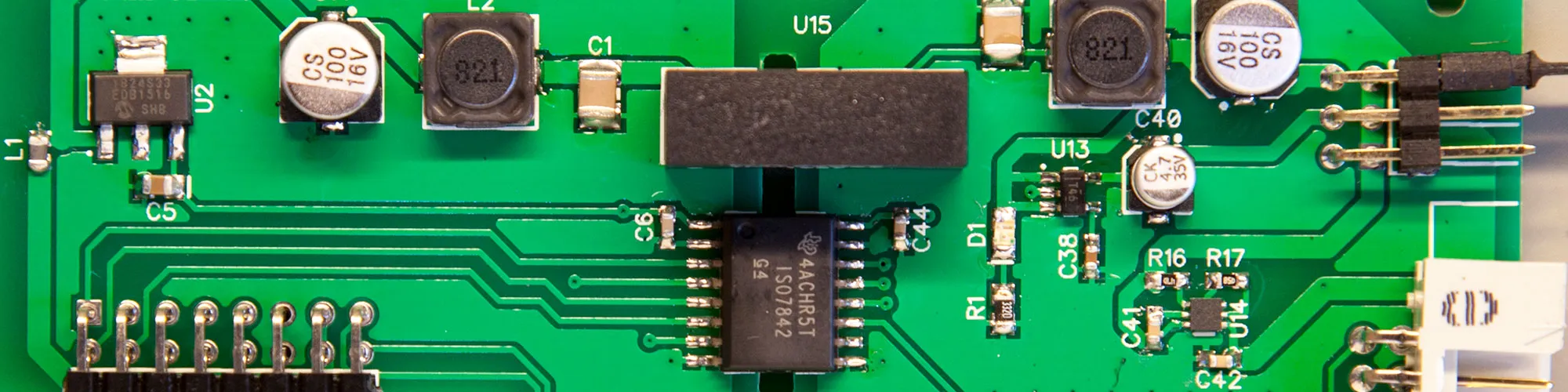 The overall design for the UART daughter board is similar to the RS232 board but with a few additions. On the PC-connected side of the board, we used the same 3.3V regulator which powers the digital isolator. As UART only needs four lines, RX, TX, RTS and CTS we used a single ISO7842 digital isolator from Texas Instruments which has two inputs and two outputs on each side of the isolator. The digital lines on the isolated side are routed directly into a six-pin IDC socket. We decided to use an IDC socket as it is smaller than a DB-9 connector and we needed some extra space for the power supply voltage selection header.