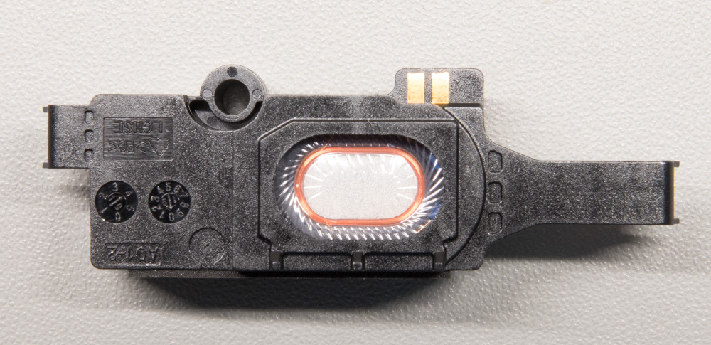 The bottom centre of the board is the audio DAC which provides the output to the speaker. A Texas Instruments TLV320DAC3100 low-power stereo audio DAC With Mono Class-D speaker amplifier. The speaker connects to the PCB using two spring clips.