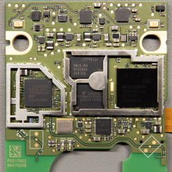 The outer-facing side of the processor board contains the connector for the flat flex cable, two push switches, 2 LEDs, 2 small ICs and a bunch of capacitors and resistors. The Bluetooth and Wi-Fi antennas are also etched into this side of the PCB either side of where the USB connector sits.