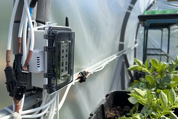 The control box was mounted onto the side metal supports, also using cable ties. Extension cables were routed carefully to reach each sensor location within the polytunnel. We ensured there was sufficient spare cable to allow easy repositioning of the sensors along the raised beds and within the potting area, accommodating both larger planting areas and smaller plant pots.